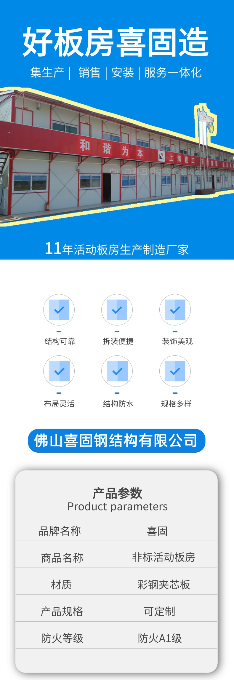 公司生產(chǎn)的“喜固”牌系列活動板房是在日式活動板房及國內(nèi)同類產(chǎn)品的基礎(chǔ)上經(jīng)過論證實踐后加改進而成的,從而使“喜固”牌系列產(chǎn)品達到快速安裝、拆遷容易、美觀、安全、節(jié)約成本等特點。
