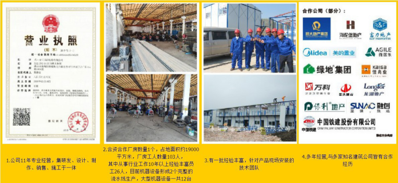 主營生產(chǎn):活動(dòng)板房、住人集裝箱房、鋼結(jié)構(gòu)廠房、輕鋼組合房、輕鋼別墅、箱式活動(dòng)房、非標(biāo)訂制活動(dòng)板房、鋼結(jié)構(gòu)大棚、工地圍蔽圍擋圍墻、室內(nèi)凈化隔墻、移動(dòng)廁所、保安亭崗?fù)さ葮I(yè)務(wù)。